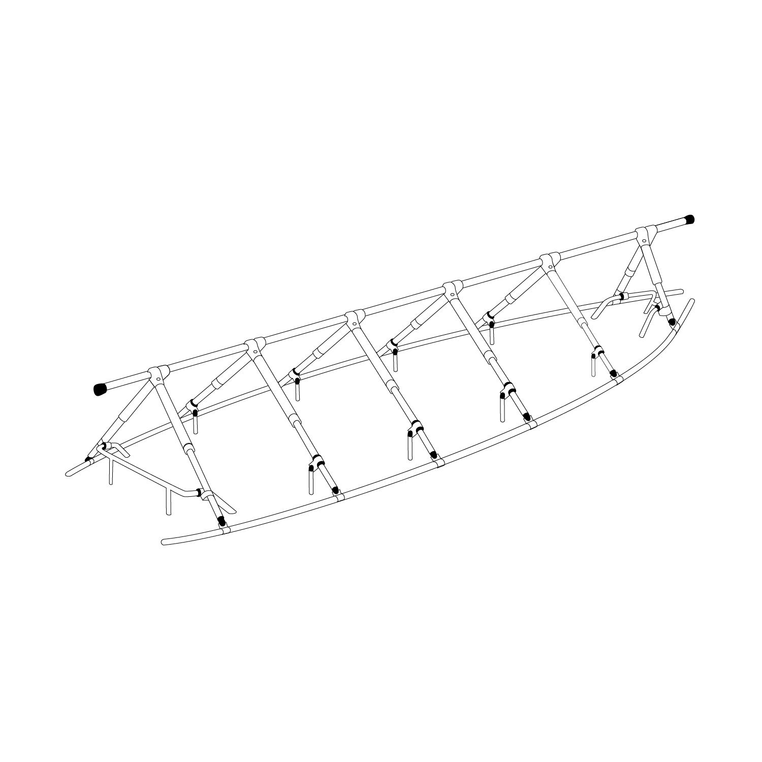 • Neljästä kahdeksaan teleskooppista jalkaparia, joihin kiinnitetään pitkittäiset veneen vapaalaiden ulkopuolella kulkevat tuuletusputket.