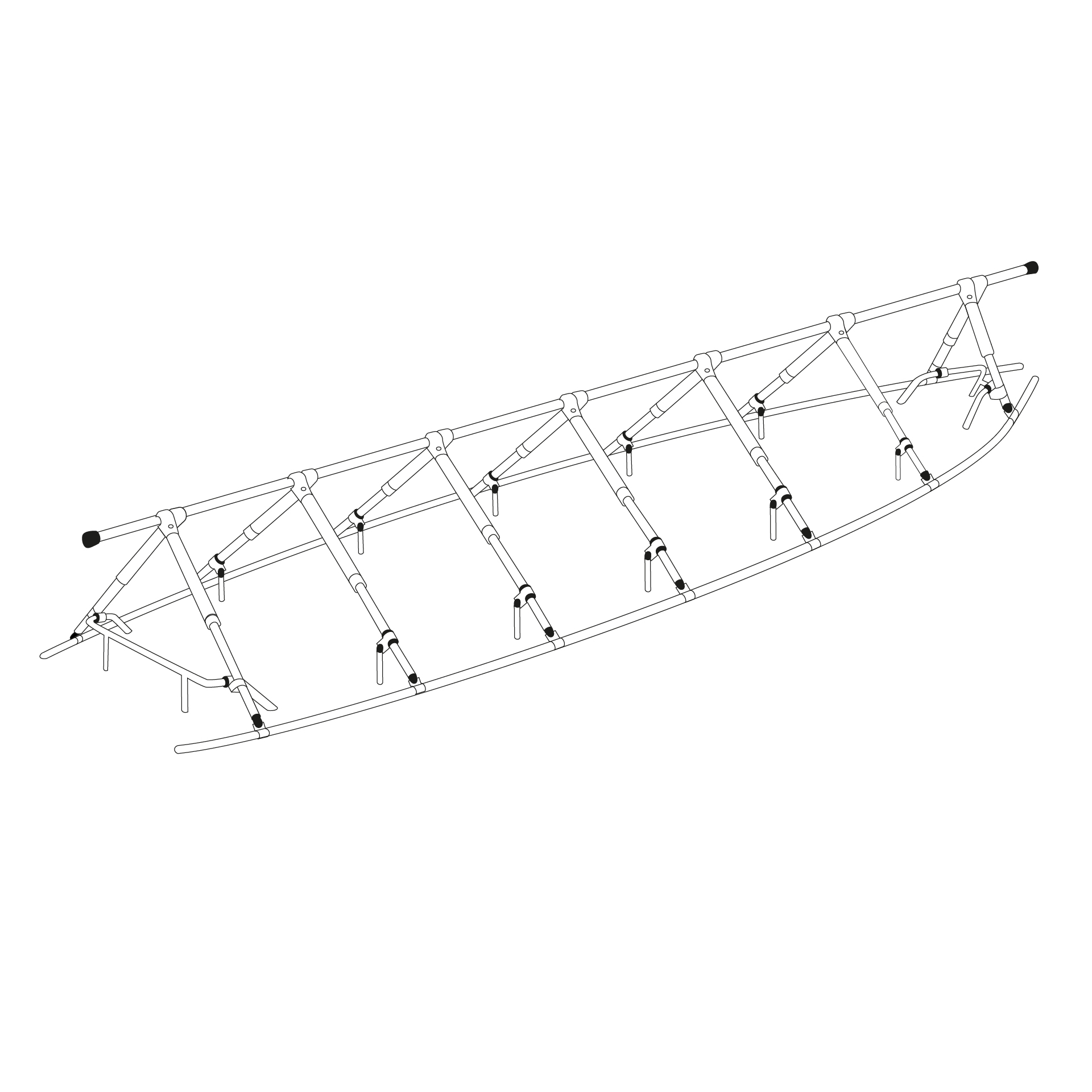 ·Neljästä kahdeksaan teleskooppista jalkaparia, joihin kiinnitetään pitkittäiset veneen vapaalaiden ulkopuolella kulkevat tuuletusputket.